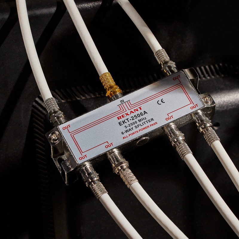 Телевизионный делитель это удобное средство для разделения сигнала на несколько равных частей. Антенные делители ,также называемые телевизионные сплиттеры часто используются, когда требуется подключить один телевизионный кабель, идущий от антенны, сразу к нескольким телевизорам или ресиверам. Особенно это актуально в многокомнатных квартирах или многокомнатных загородных домах. Делитель имеет один вход под F разъем и шесть выходов, также под F разъемы. Сигнал, подающийся на вход делителя, делится на две равные части и передается на выходы. Для подключения кабелей используются стандартные F-разъемы. Полоса пропускания делителя от 5 до 2500МГц позволяет использовать его в системах спутникового телевидения. Качественно изготовленный ТВ сплиттер REXANT долго и надежно прослужит в составе телевизионной системы, делая удобной эксплуатацию нескольких телевизоров.
