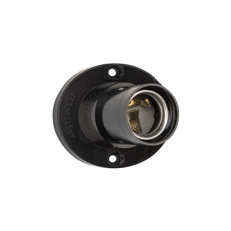 Наклонный карболитовый настенный патрон Е27, черный используется для фиксации ламп и подведения их к электрической сети при подключении бытовых или промышленных источников освещения. Патрон имеет керамическую центральную вставку, которая обладает пожаробезопасными свойствами. Корпус патрона выполнен из электроизоляционного материала - карболита. Он так же обладает термоустройчивостью, не подвержен коррозии, не разрушается под действием агрессивных сред.