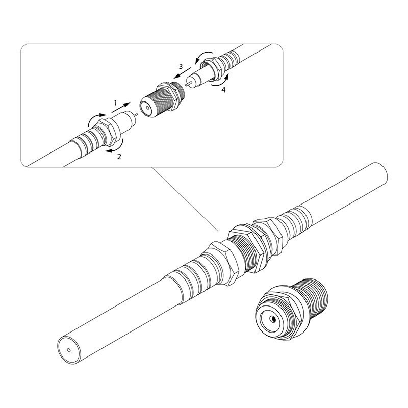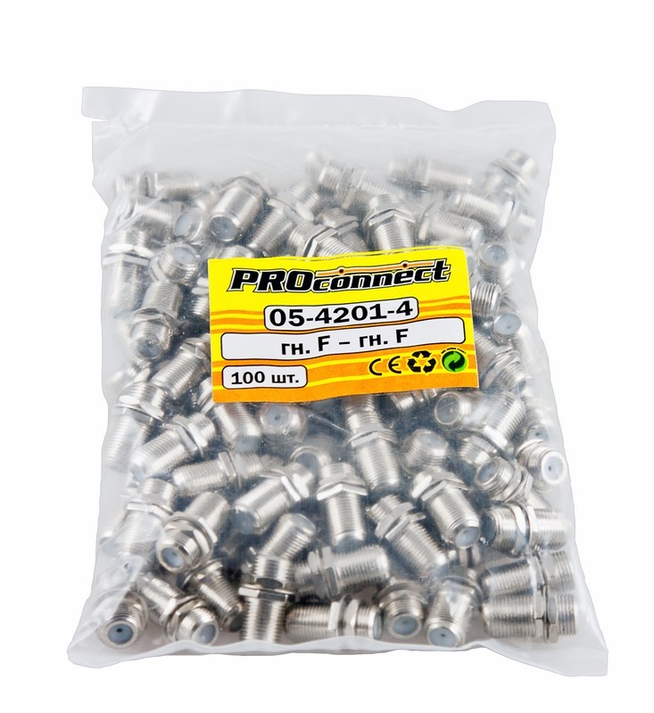 ПЕРЕХОД гнездо F - гнездо F "БОЧКА" с кольцом PROconnect предназначен для соединения двух частей коаксиального кабеля волновым сопротивлением 50 или 75 Ом, на концах которых расположены штекеры F-разъема. Применяется главным образом для подключения эфирного, кабельного и спутникового телевидения к телевизионному оборудованию. В частности, он позволяет увеличить длину антенного кабеля или соединить поврежденный участок. Изготовлен переход из никелированного сплава первичной меди (биметалл), что обеспечит долговечность соединения и возможность применять его в условиях климатических перепадов. Разъем соединяет кабель методом накрутки F-коннектора с обеих сторон после соответствующей зачистки контактов и не требует в ходе монтажа применения каких-либо специальных инструментов.
