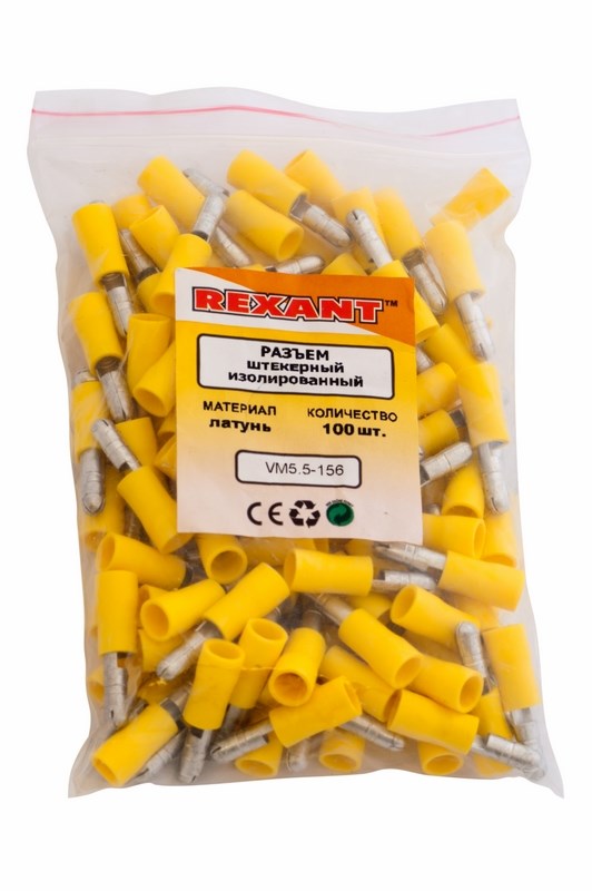 Изолированная штекерная клемма REXANT состоит из двух компонентов: металлического коннектора (штекер) и защитного изолятора, закрывающего место обжима провода. Металлический коннектор изготовлен из латуни, с поверхностным электролитическим лужением, а изолятор клеммы из поливинилхлорида (ПВХ), надежно защищающий место обжима кабеля от физических воздействий, а человека от поражения электрическим током. Обжатие производится специальными пресс-клещами (ht-301 H, ht-301 N, ht-301 W) поверх защитного изолятора. Цвет изолятора желтый.
