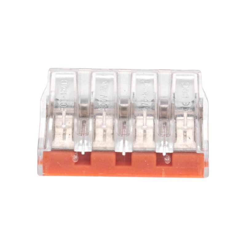 Строительно-монтажная экспресс-клемма REXANT предназначена для подсоединения медных одножильных проводников. Является одним из самых быстрых, надежных и удобных способов монтажа проводников в условиях нехватки и ограничения площади. Обеспечивает экономию места до 50% по сравнению с простыми пружинными клеммами.<br> Компактный прозрачный корпус удобен для контроля соединения, а яркая цветовая разметка способствует визуальному различию клемм по количеству проводников.<br> Экспресс-клеммы одновременно подходят для медных и алюминиевых проводников.<br> Прочный корпус из высококачественных материалов не поддерживает горение.<br> Быстрый монтаж обеспечивается за счет пружинного способа соединения.<br> <br> Технические характеристики: <br> Материал корпуса: полиамид 66<br> Контакты: луженая медь <br> Количество контактов: 4<br> Цвет: прозрачный<br> Напряжение: 400 В <br> Ток: 41 А <br> Поддерживаемое сечение: 4x0,75-6 мм² (одножильный провод)<br> Длина зачистки изоляции: 12 мм <br> Рабочая температура: –40...+85 °С