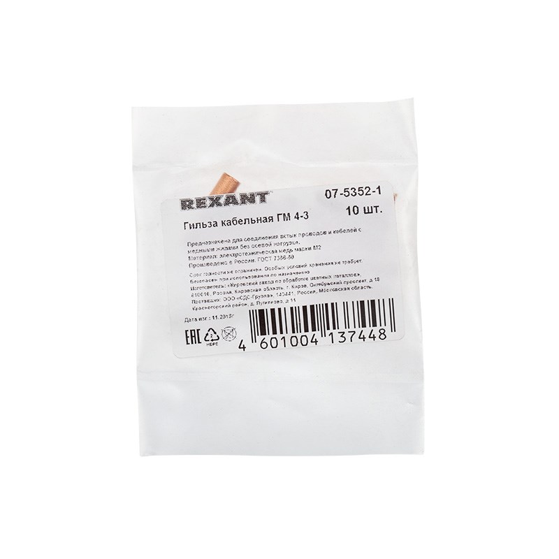 Гильза медная ГМ 4-3 (4мм² - Ø 3мм) (в упак. 10 шт. ) REXANT