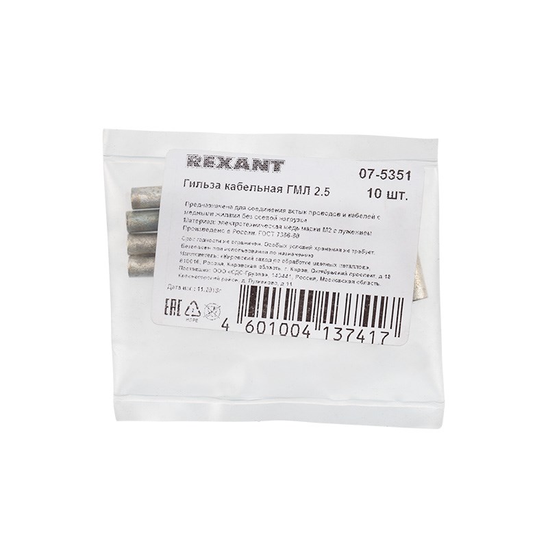 Гильза медная луженая ГМЛ 2,5-2,6 (2,5мм² - Ø 2,6мм) ГОСТ 23469.3-79 (в упак. 10 шт. ) REXANT