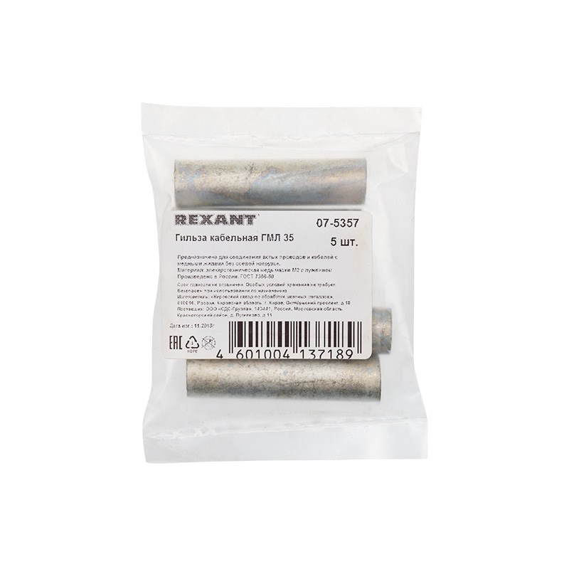 Гильза медная луженая ГМЛ 35-10 (35мм² - Ø 10мм) ГОСТ 23469.3-79 (в упак. 5 шт. ) REXANT