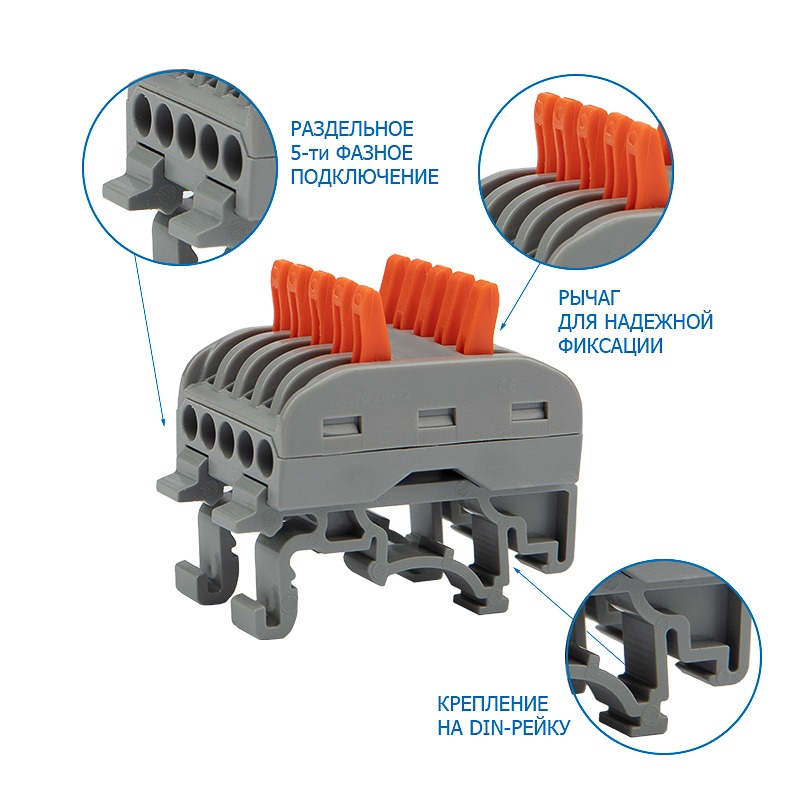 Клемма СМК 222-425D проходная 5-полюсная, с креплением на DIN-рейку (0,08-4 мм²) серая (20 шт. /уп. ) REXANT