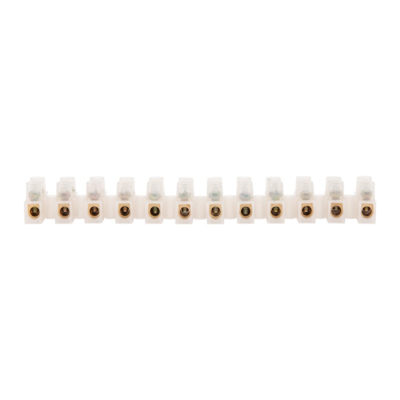Соединение осуществляется с помощью медных контактов. Кабели и провода фиксируются винтовым зажимом. Клеммная колодка изготовлена из полупрозрачного полиэтилена.