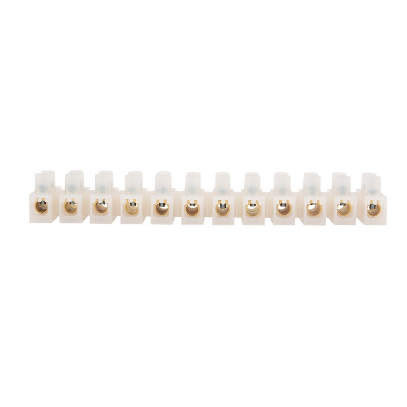 Соединение осуществляется с помощью медных контактов. Кабели и провода фиксируются винтовым зажимом. Клеммная колодка изготовлена из полупрозрачного полиэтилена.