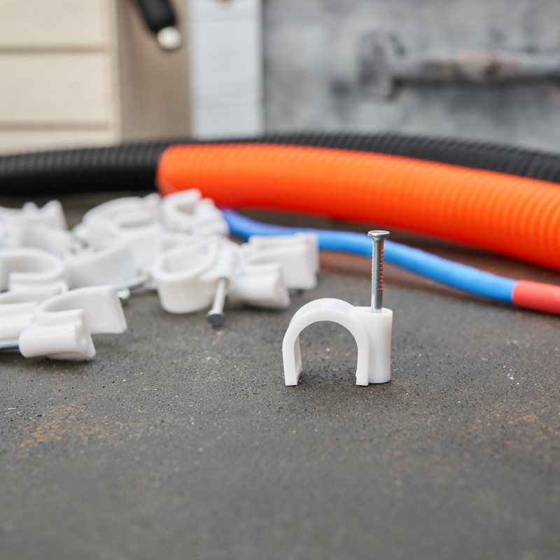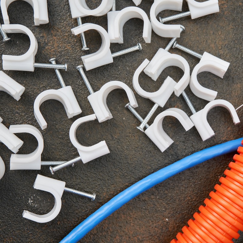 Высококачественный круглый крепеж кабеля REXANT представляет собой дугообразную пластиковую скобу диаметром 14 мм с гвоздём. Используется для мгновенного, а главное надёжного крепления проводов и кабелей к поверхностям стен, несущих конструкций и потолков. Гвоздик выполнен из закаленного металла, что позволит надежно забивать его даже в плотные и твердые материалы, не опасаясь сломать или погнуть гвоздь.