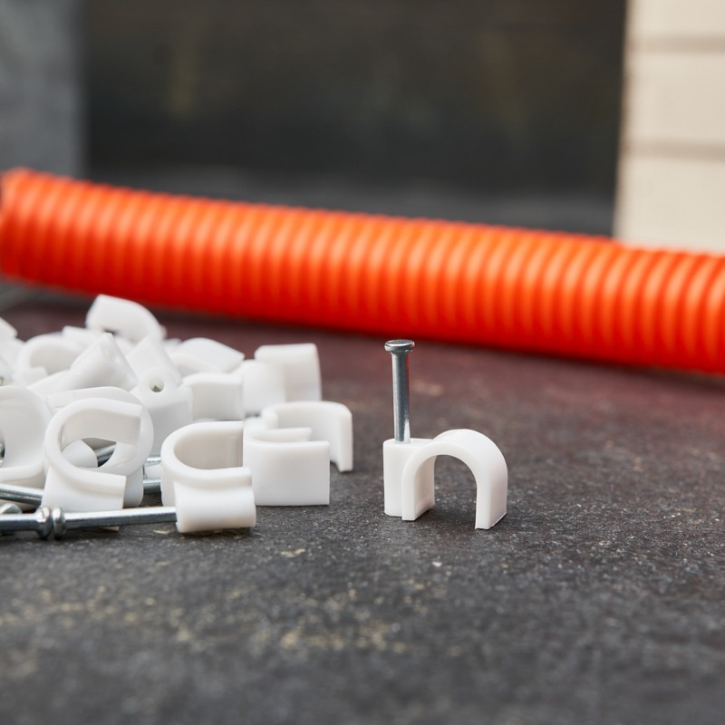 Высококачественный круглый крепеж кабеля REXANT представляет собой дугообразную пластиковую скобу диаметром 9 мм с гвоздём. Используется для мгновенного, а главное надёжного крепления проводов и кабелей к поверхностям стен, несущих конструкций и потолков. Гвоздик выполнен из закаленного металла, что позволит надежно забивать его даже в плотные и твердые материалы, не опасаясь сломать или погнуть гвоздь.