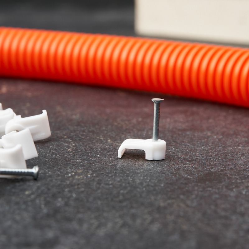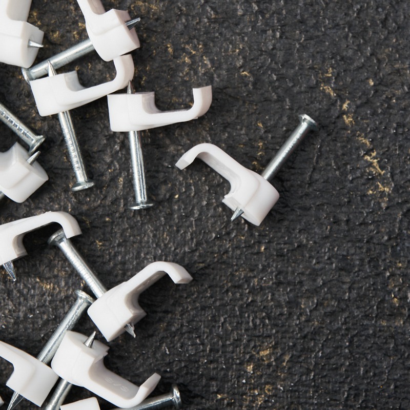 Высококачественный плоский крепеж кабеля REXANT представляет собой П-образную пластиковую скобу, выполненную из качественного пластика и идущую в комплектации с гвоздём из закаленного металла, при помощи которого данная скоба крепит к стенам, потолкам и несущим конструкциям кабели, провода.