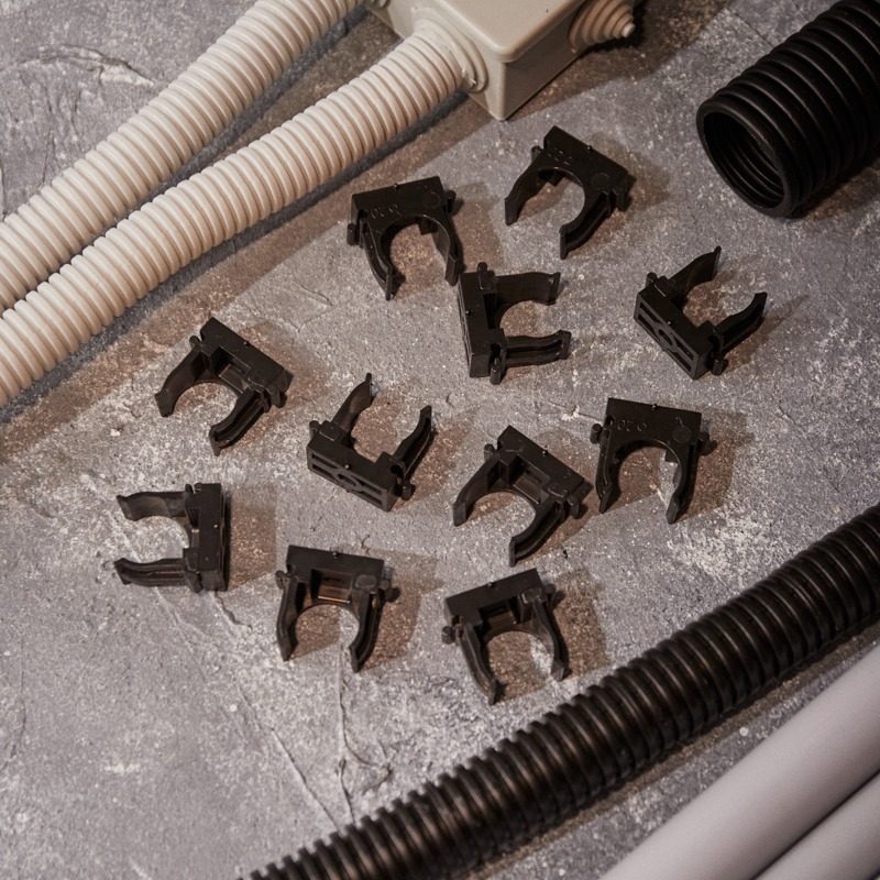 Изделие оснащено фиксаторами типа "шип-паз": при установке возможно соединять крепежи-клипсы различных диаметров.