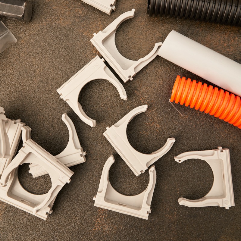 Крепеж для гофры, гофротрубы (клипса для гофротрубы), труб ПВХ и кабеля изготовлен из качественных материалов по передовым технологиям пластикового литья. <br> Оптимальная форма с грамотно расположенными ребрами жесткости обеспечивают надежный захват трубы и достаточную жесткость удержания в течении длительного времени. <br> Качественный пластик и прочностные ребра жесткости не дают ломаться зажиму на холоде и слабнуть на жаре. Зажимы противостоят ультрафиолетовым излучениям, солям, кислой среде и алкалинам.
