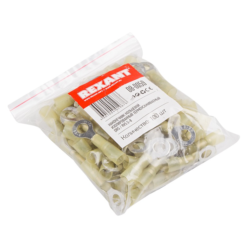 Наконечник кольцевой изолированный термоусаживаемый (НКИт ø 8.4 мм) 4-6 мм² REXANT предназначен для создания качественного подключения электрооборудования, которое осуществляется через контактное соединение на основе винтовой фиксации. Такая клемма используется для оконцовывания многожильных медных проводов при монтаже мобильных электрических контактов на подвижном составе (автомобиле-, вагоно-, самолето- и судостроении) или в других местах, где важна надежность соединения (к примеру, телефонное или климатическое оборудование). <br> Изолированный кольцевой наконечник REXANT состоит из двух компонентов: металлического коннектора и защитного изолятора. Главной отличительной особенностью такого наконечника является термоусаживаемый изолятор клеммы с клеевым краем, что обеспечит защиту места обжима кабеля от попадания влаги и грязи. Металлический коннектор изготовлен из меди, с поверхностным электролитическим лужением. Обжатие производится специальными пресс-клещами (ht-301 H арт.12-3014, 12-3014; ht-301 N арт.12-3116; ht-301 W арт.12-3021, 12-3021-4) поверх защитного изолятора. После обжатия при нагревании наконечника происходит усадка термоизоляционной трубки на кабеле — это обеспечит герметичность соединения. Цвет изолятора прозрачно-желтый. <br> <br> Основные характеристики:<br> Сечение применимых медных многопроволочных проводов: 4-6 мм²<br> Рабочий размер кольцевого отверстия: d2 = 8.4 мм<br> Максимально допустимая величина пропускаемой силы тока: 48 А<br> Температурный диапазон: -40..+80 ℃<br> <br> Применение изолированных кольцевых наконечников дает возможность существенно ускорять электромонтажные работы, при этом появляется возможность многократного отсоединения и присоединения проводов.