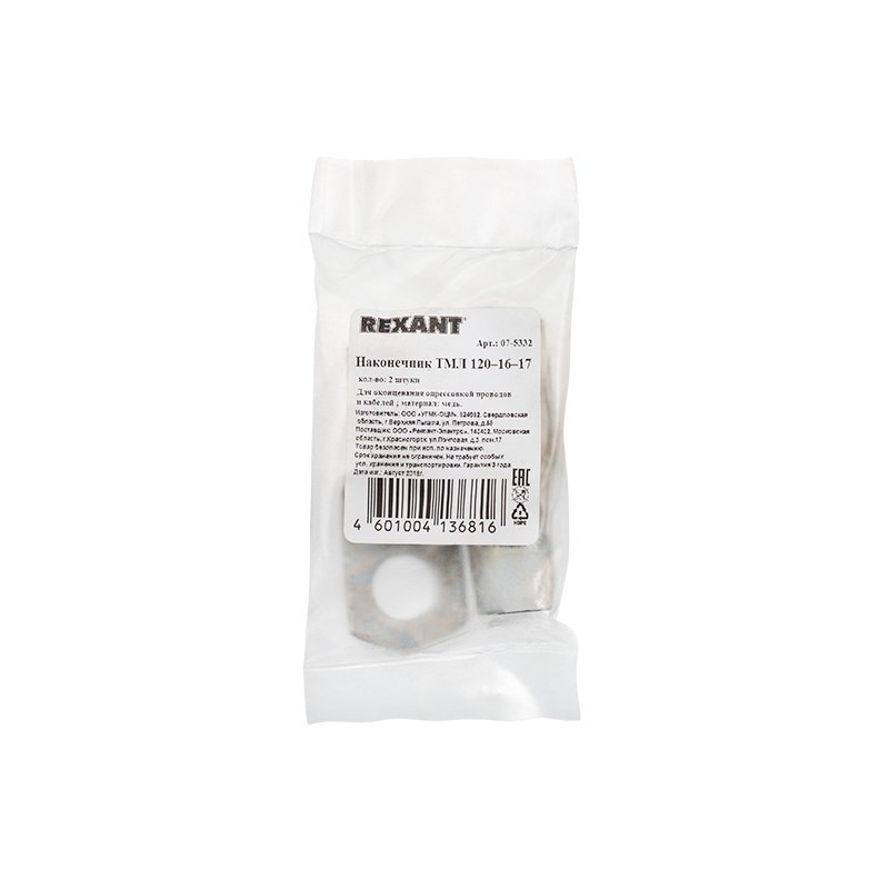 Наконечник медный луженый ТМЛ 120–16–17 (120мм² - Ø 16мм) ГОСТ 7386-80 (в упак. 2 шт. ) REXANT