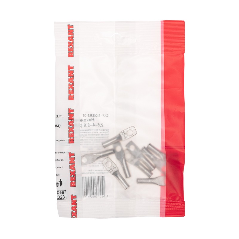 Наконечник ТМЛ 2,5–4–2,6 (2,5мм² - Ø5мм) REXANT предназначен для оконцевания проводов и кабелей с медными и алюминиевыми жилами посредством опрессовки для последующего болтового соединения проводника с оборудованием или шиной. <br> Выполнен из высококачественной меди с лужением.<br> <br> Структура обозначения:<br> Т — Труба — полуфабрикат, из которого изготовлен наконечник <br> М — Медь — материал, из которого изготовлен наконечник <br> Л — Луженый — покрытие<br> 2,5 — номинальное сечение наконечника, мм²<br> 4 — диаметр контактного стержня, мм<br> 6 — внутренний диаметр хвостовика, мм