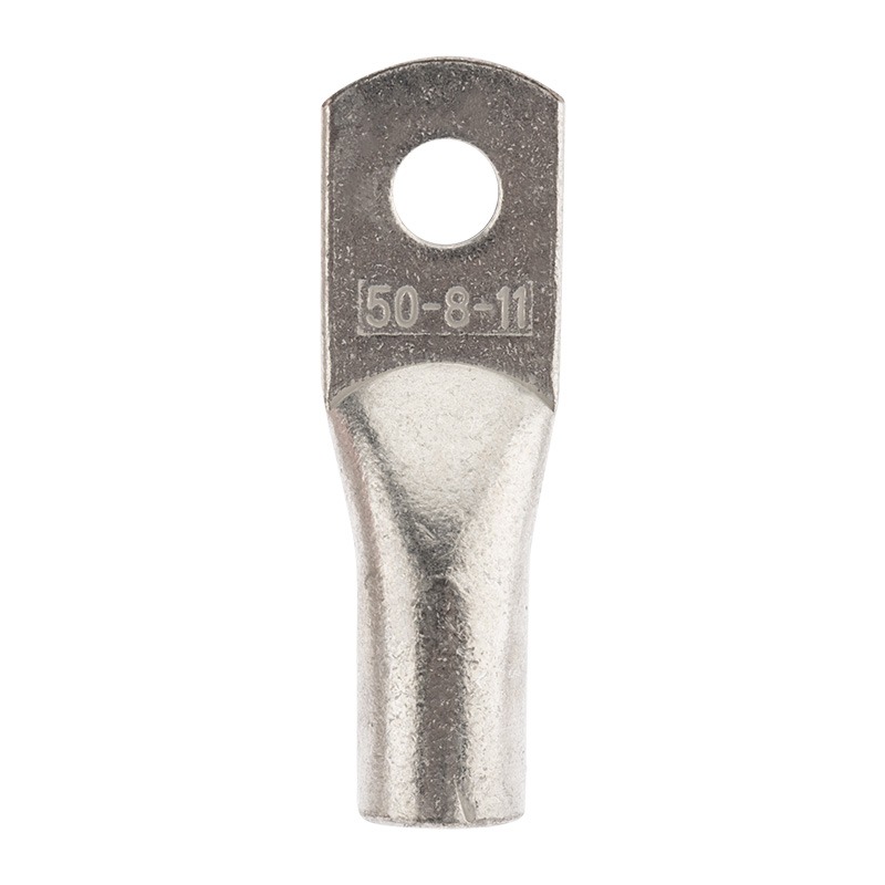 Наконечник ТМЛ 50–8–11 (50мм² - Ø8мм) REXANT предназначен для оконцевания проводов и кабелей с медными и алюминиевыми жилами посредством опрессовки для последующего болтового соединения проводника с оборудованием или шиной.