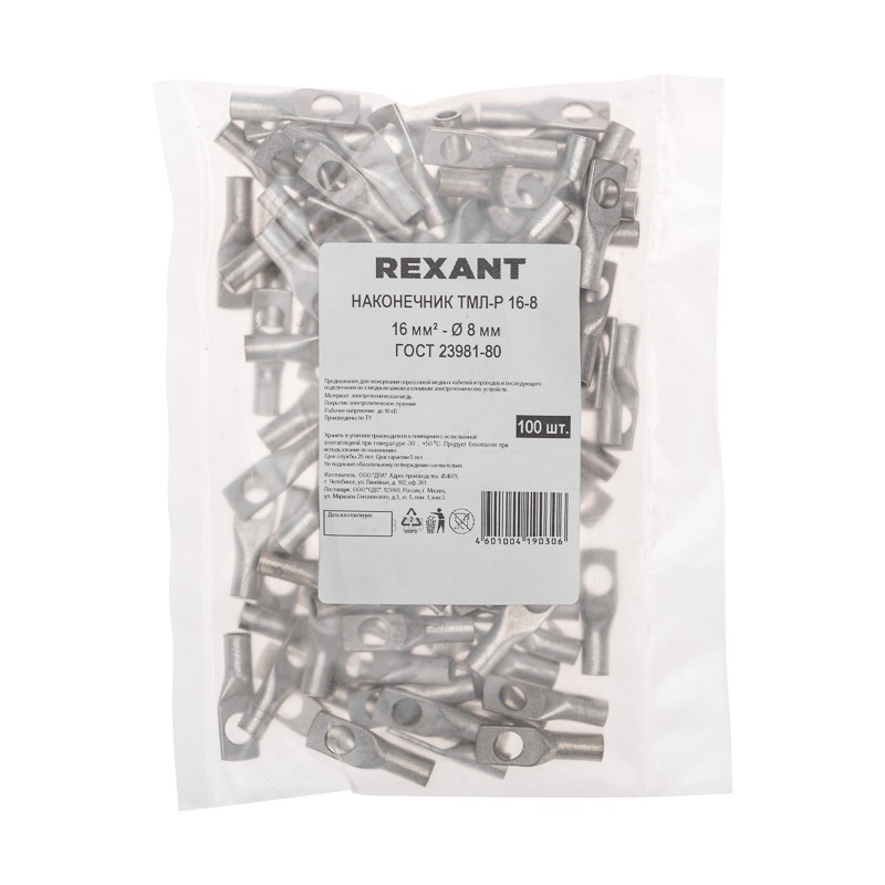 Наконечник медный луженый ТМЛ-Р 16–8 (16мм² - Ø8мм) (в упак. 100 шт. ) REXANT