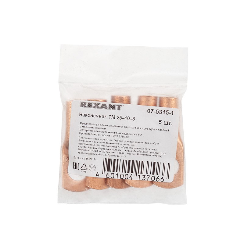 Наконечник медный ТМ 25–10–8 (25мм² - Ø 10мм) (в упак. 5 шт. ) REXANT