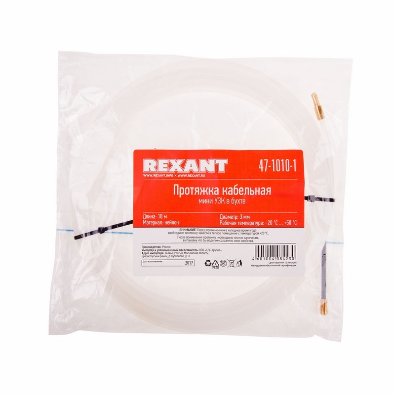 Протяжка кабельная REXANT (мини УЗК в бухте), 10 м нейлон, d=3 мм, латунный наконечник, заглушка