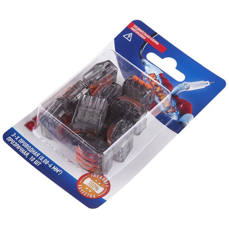 Универсальная клемма СМК 222-413, 3-проводная прозрачная 0,08-2,5/4 мм² (блистер 10 шт/уп) REXANT