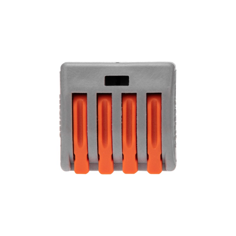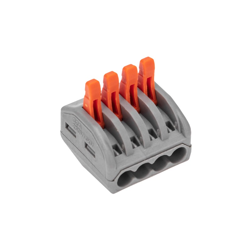 Соединительная многоразовая клемма REXANT на 4 проводника с плоско-пружинным зажимом предназначена для подсоединения медных одножильных и многожильных зачищенных проводников тонкого сечения. <br> Перед монтажом с соединяемых проводников необходимо снять изоляцию в соответствии с обозначениями на корпусе клеммы (9-12 мм). Зачищенный участок с монтажной стороны не должен иметь сильных изгибов. Вставьте его в свободное гнездо клеммы, предварительно подняв оранжевый рычажок, после этого опустите рычажок в исходное положение. Контакт осуществляется путем зажима проводника пластиной. Конструкция предотвращает случайное размыкание контакта. <br> Специальное технологическое отверстие на корпусе клеммы предназначено для проверки соединения тестером-пробником или щупом мультиметра. Корпус из пластика делает контакт изолированным.<br> Для извлечения проводника (демонтажа) необходимо повторить указанные действия в обратном порядке.<br> <br> Характеристики:<br> Материал: Полиамид 66;<br> Количество контактов: 4;<br> Материал контактов: луженая медь;<br> Зажим: сталь;<br> Цвет: серый;<br> Напряжение: 400В;<br> Типы подключаемых проводов: одножильные, многожильные;<br> Ток: для одножильных проводов — 32А, для многожильных проводов — 24А;<br> Поддерживаемое сечение: 4x0.08-4мм² (одножильный провод), 4x0.08-2.5мм² (многожильный провод);<br> Рабочая температура: –40...+85 ºC.