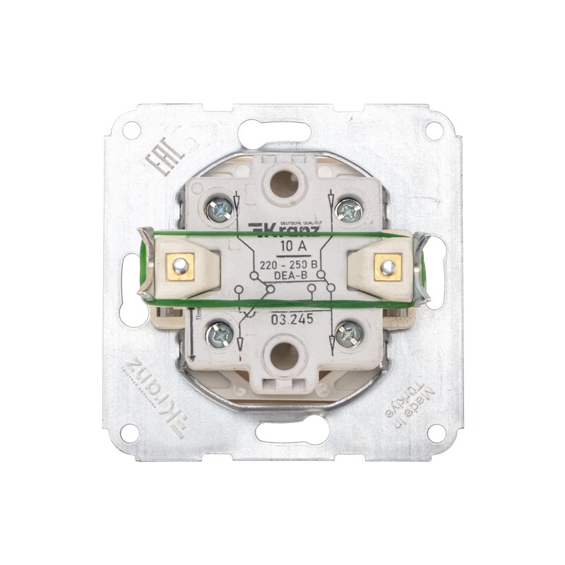 Механизм одноклавишного выключателя KRANZ – серия DEA, для скрытого монтажа, на ток 10А. Предназначен для подключения к электрической сети внутри помещений для включения и выключения света.