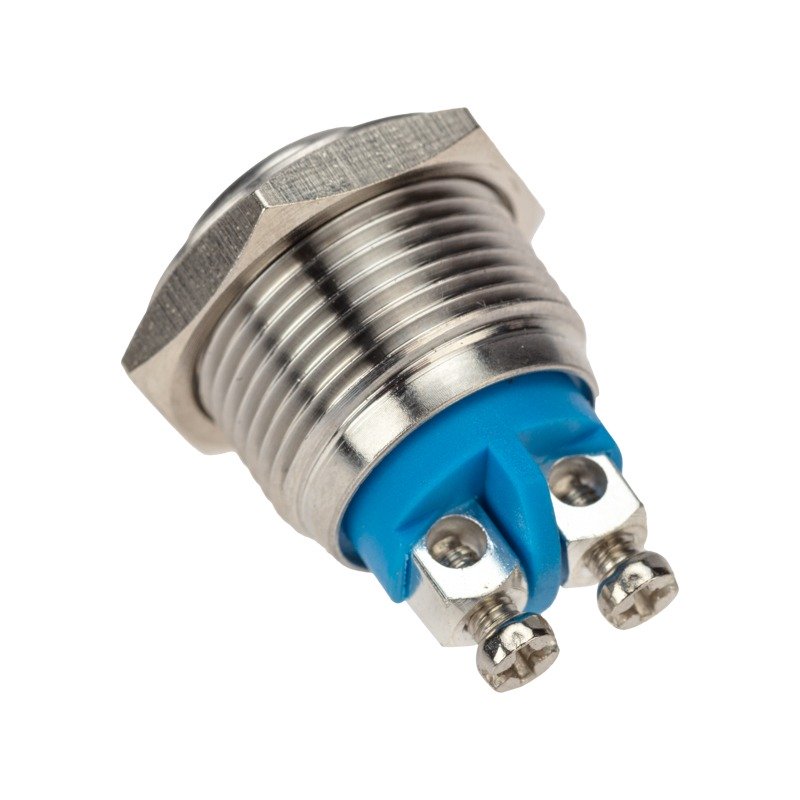 Кнопка антивандальная Ø12 36В(LED) Б/Фикс (4с) OFF-(ON) синяя (A-12-C2) REXANT предназначена для коммутации электрических цепей, путем включения-выключения питающего провода. Такие кнопки применяются в местах, где существует большой риск их повреждения (на различных производственных линиях, в лифтовых кабинах, около входной двери и т.д.). Главными отличительными особенностями антивандальной кнопки являются металлическое исполнение и неуязвимость контактной группы, что обеспечит ей долговечное функционирование. Изделие состоит из двух основных частей - лицевой части (головки) и контактной, и имеет пружинный возвратный механизм. Монтаж осуществляется без применения винтов на плоских панелях толщиной от 0.5мм до 3мм. Подключение проводов осуществляется с помощью винтовых зажимов.<br> Основные характеристики:<br> Подсветка:12V LED<br> Номинальное напряжение и ток: 2A/36V(DC) 2A/250V(AC);<br> Тип переключения: OFF-(ON);<br> Количество контактных групп: 1;<br> Количество контактов в контактной группе: 2;<br> Фиксация положений: отсутствует;<br> Индикатор коммутационных положений: синий;<br> Установочный диаметр: 12мм;<br> Рабочая температура: от -25℃ до +85℃;<br> Степень защиты (IP): IP65;<br> Ресурс: 10 000 циклов.<br> Преимуществами использования данного изделия является надежность, быстрота и удобство монтажа.