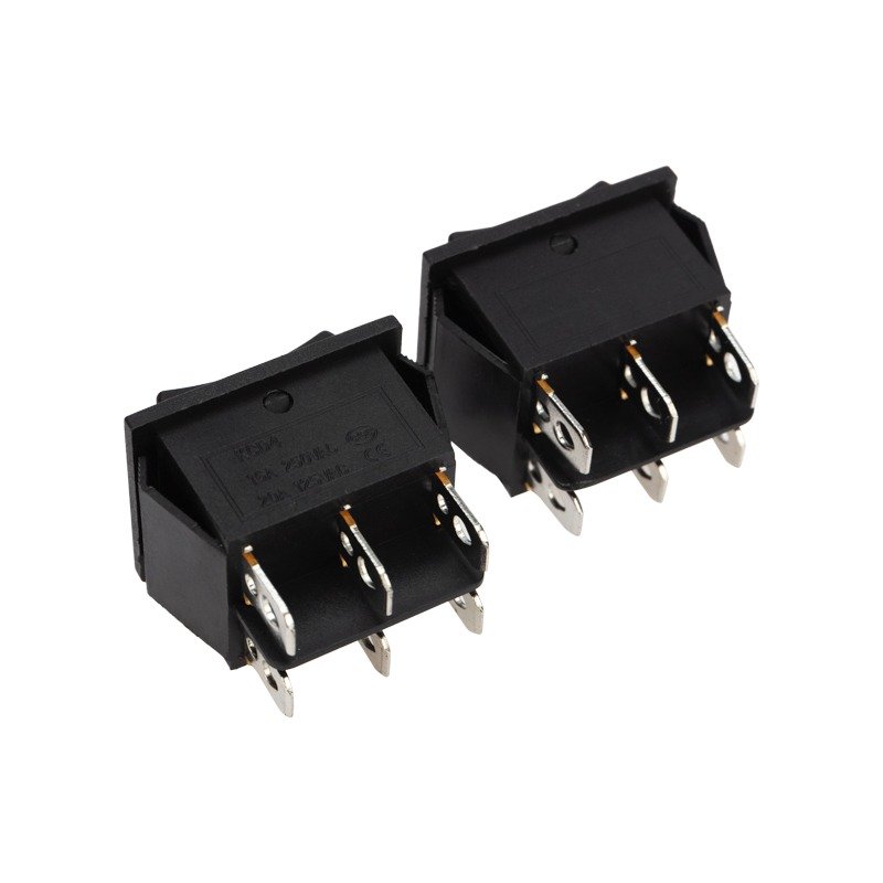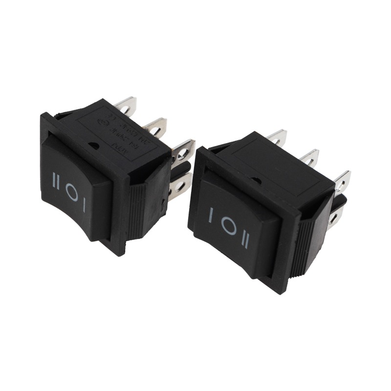 Переключатель клавишный 250V 15А (6с) (ON)-OFF-(ON) черный с нейтралью Б/Фикс предназначен для коммутации электрических цепей переменного тока напряжением до 250В. Клавишные (Рокерные) выключатели применяются в качестве комплектующих изделий различного электрооборудования (в сетевых фильтрах и удлинителях, аудио-оборудовании, блоках питания, электроустановках на различных производствах, автомобилях, и многих других местах). Такой клавишный переключатель имеет три положения. Принцип действия основан на перемещении клавиши в одну из позиций. Для переключения в нужное положение требуется приложить некоторые усилия на клавишу. Монтаж осуществляется без применения винтов на плоских панелях толщиной от 0.8мм до 3мм. Подключение контактов осуществляется плоской клеммой 6.6мм, либо с помощью пайки.