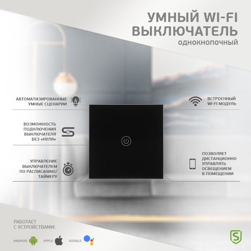 Сенсорный однокнопочный выключатель черного цвета предназначен для управления освещением в помещениях разного типа. <br> Высокотехнологичное устройство с панелью из прочного закаленного стекла мгновенно срабатывает при легком нажатии на сенсорную кнопку. <br> Управление прибором может выполняться дистанционно с помощью смартфона. Пользователь может устанавливать точное время включения/выключения световых приборов. <br> Устройство предусматривает подключение без нулевого провода, а также позволяет оптимизировать расход электроэнергии.<br> Выключатель может использоваться самостоятельно, а также совместно с другими устройствами интеллектуальной системы «Умный дом» и принимать участие в автоматизированных умных сценариях. <br> Конструкция аккуратно монтируется в стену, не нарушая дизайн интерьера.