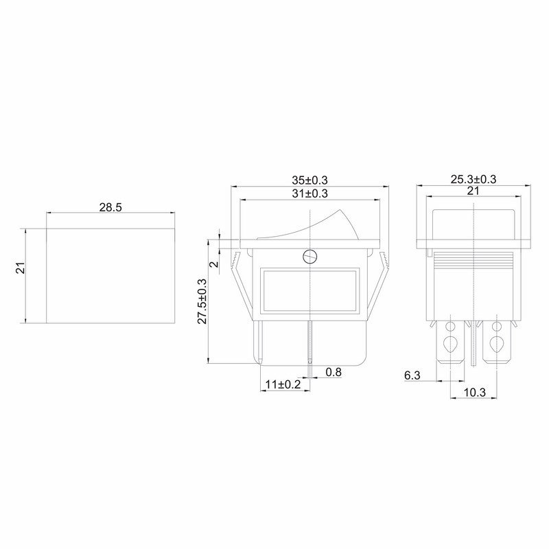Выключатель клавишный 250V 16А (4с) ON-OFF зеленый с подсветкой (RWB-502, SC-767, IRS-201-1) предназначен для коммутации электрических цепей переменного тока напряжением до 250В. Клавишные (Рокерные) выключатели применяются в качестве комплектующих изделий различного электрооборудования (в сетевых фильтрах и удлинителях, аудио-оборудовании, блоках питания, электроустановках на различных производствах, автомобилях, и многих других местах). Такой клавишный переключатель имеет два положения. Принцип действия основан на перемещении клавиши в одну из позиций. Для переключения в нужное положение требуется приложить некоторые усилия на клавишу. Монтаж осуществляется без применения винтов на плоских панелях толщиной от 0.8мм до 3мм. Подключение контактов осуществляется плоской клеммой 6.6мм, либо с помощью пайки.