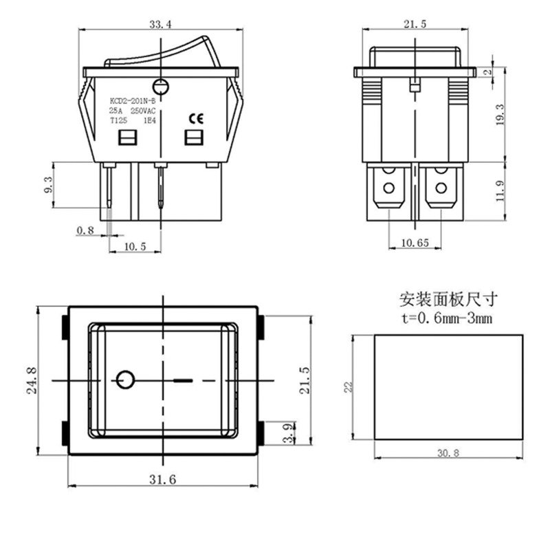 Монтаж осуществляется без применения винтов на плоских панелях толщиной от 0.8 мм до 3 мм. Подключение контактов осуществляется плоской клеммой 6.6 мм либо с помощью пайки.