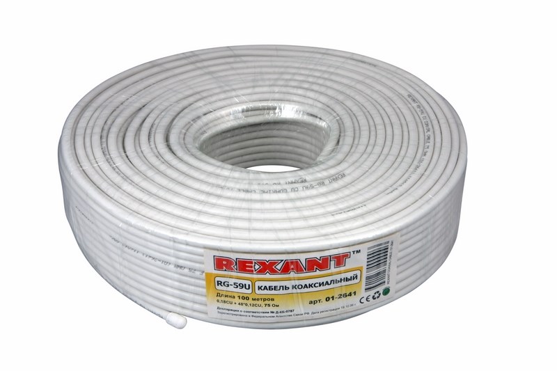 Кабель коаксиальный RG-59U+Cu, 75 Ом, Cu/Al/Cu, 64%, 100 м, INDOOR, белый, REXANT