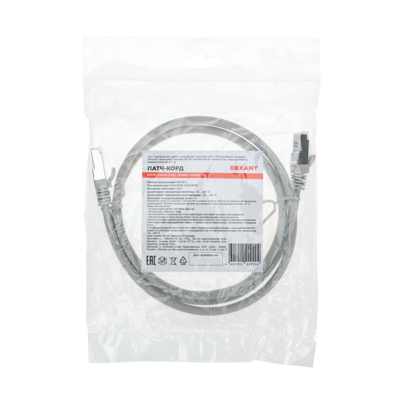 Патч-корд S/FTP REXANT предназначен для подключения активного и пассивного сетевого оборудования в составе структурированной кабельной системы. <br> Он необходим для соединения телекоммуникационного оборудования: компьютеры, офисные АТС, сетевые коммутаторы, концентраторы, коммутационные панели, маршрутизаторы, патч-панели в телекоммуникационных стойках, сетевые карты, а также другого оборудования, имеющего разъемы RJ-45.<br> Патч-корд представляет собой шнур из 4 пар изолированных проводников, скрученных между собой, находящихся в общей изоляции с разъемами типа RJ-45. <br> Заливные колпачки с защитой замочков предназначены для большего удобства переключения.<br> Контакты с золотым покрытием 50 мкд обеспечивают не менее 750 циклов подключения.<br> Оболочка патч-корда выполнена из малодымного безгалогенного компаунда (LSZH).<br> Патч-корд REXANT соответствует международным стандартам.<br> <br> Категория: 6A<br> Полоса пропускания: 500 МГц<br> Материал токопроводящей жилы: Cu<br> Диаметр токопроводящей жилы: 28AWG (7x0,12 мм)<br> Материал изоляции токопроводящей жилы: полиэтилен<br> Тип коннектора: RJ45/8P8C-RJ45/8P8C<br> Тип проводников: многожильный (Stranded)<br> Экранирование: UTP (U/UTP)<br> Защитный колпачок: заливной, с защитой защелки<br> Внешний диаметр кабеля: 3.9 мм<br> Материал оболочки: LSZH<br> Соответствие стандартам: ISO/IEC 11801, TIA/EIA-568, EN 50173<br> Поддерживаемые приложения: 10BASE-T, 100BASE-TX, 100BASE-T4, 1000BASE-T, 10GBASE-T, ATM-25, ATM-51, ATM-155<br> Допустимая температура монтажа: 0…+60 °С<br> Допустимая температура эксплуатации: -20…+60 °С