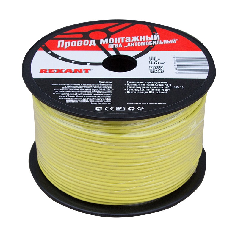 Провод ПГВА REXANT 1х0.75 мм², желтый, бухта 100 м