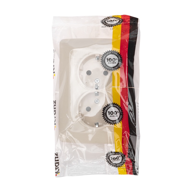 Розетка двойная KRANZ – серия DEA, материал керамика, для скрытого монтажа, на ток 16А, с заземлением. Механизм из керамики выдерживает большие температуры монтажа и эксплуатации. Предназначена для использования в квартирах, офисах, в загородном строительстве, в сухих помещениях с повышенным температурным режимом при подключении электроприборов к силовой электрической сети.