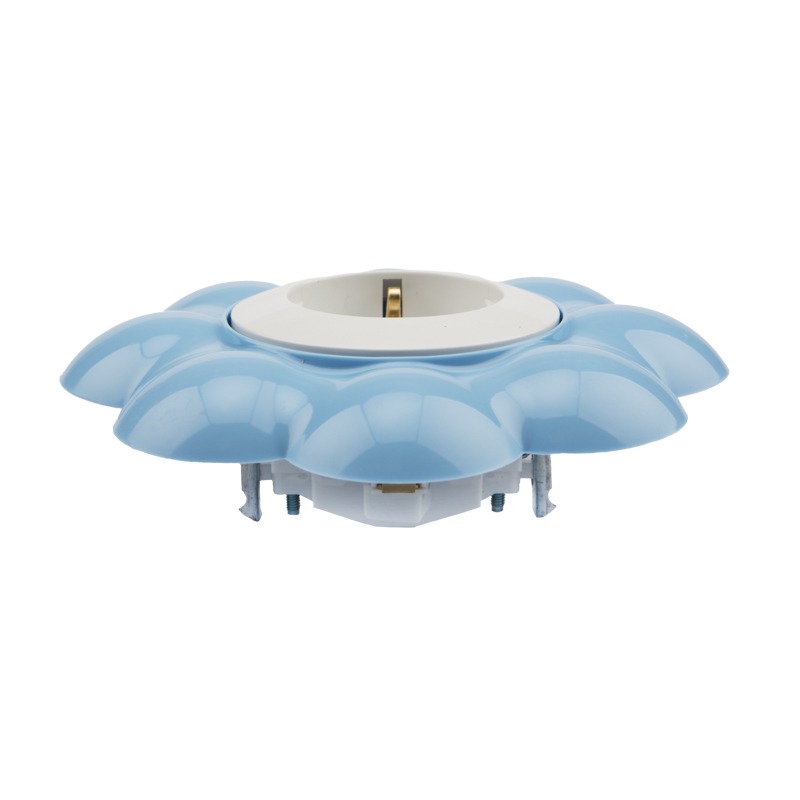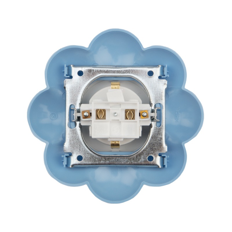 Розетка одноместная KRANZ HAPPY Цветок скрытой установки, с заземлением и защитными шторками, белая/голубая