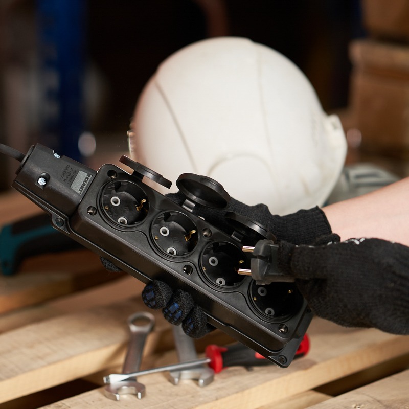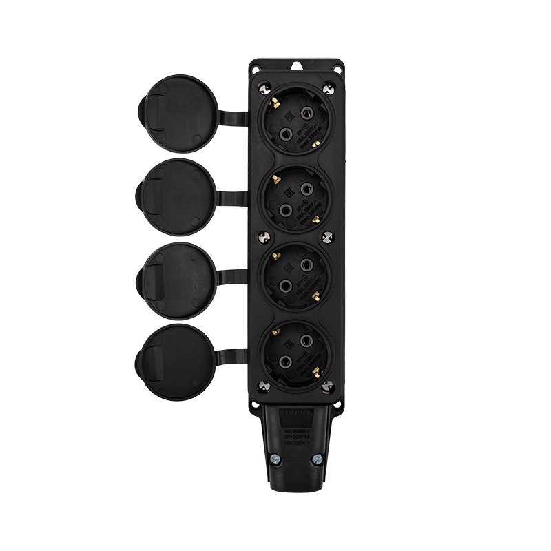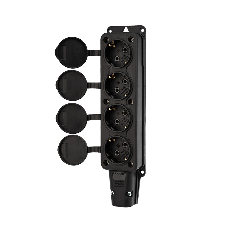 Электрическая влагозащищенная штепсельная четырехместная розетка из каучука REXANT предназначена для использования в сложных эксплуатационных условиях с высокой влажностью и широко применяется в быту, производстве и строительстве. Она имеет степень защиты IP54 – защита от капель и брызг воды, попадающих под любым углом, и может быть применена для организации электропитания, в том числе под открытым небом. В дождь под навесом. Не допускается эксплуатация погружением в воду. Она легко монтируется, имеет высокую надежность и долгий срок службы. Количество штепсельных розеток с заземляющим контактом четыре штуки. Допускается присоединение четырех вилок одновременно с суммарным максимальным током по ним 16 А. Каждое розеточное место оснащено защитной крышкой. Розетка может быть применена как в переносном, так и в стационарном варианте применения. Для крепления к поверхности розетка имеет специальные отверстия. Для обеспечения безопасности все детали, соприкасающиеся с токоведущими частями, выполнены из огнеупорного материала, устойчивого к температуре до +850 ⁰С.<br> Ударопрочный разборный корпус выполнен из каучука – полимерный материал, сочетающий внешний вид, упругость и эластичность обычного каучука и эффективность обработки пластмасс.<br> <br> Преимущества каучуковых корпусов электрических разъемов:<br> Отличная износостойкость при изгибе<br> Хорошие диэлектрические свойства<br> Хорошая стойкость к разрыву и истиранию<br> Высокий диапазон рабочий температур<br> Высокая эластичность и стойкость к ударам, в том числе и при низких температурах<br> Низкий удельный вес<br> Отличная стойкость к химикатам и атмосферному воздействию<br> Высокая водонепроницаемость <br> <br> Характеристики:<br> Напряжение: 200-250 В<br> Номинальный ток: 16 А<br> Класс защиты: IP54<br> Заземление: есть<br> Корпус: каучук<br> Сечение проводников: 0,75-2,5 мм²<br> Количество розеток: 4<br> Контактная группа: латунь<br> Рабочая температура: -40...+80 °С<br> Тип полюсов: 2Р+РЕ