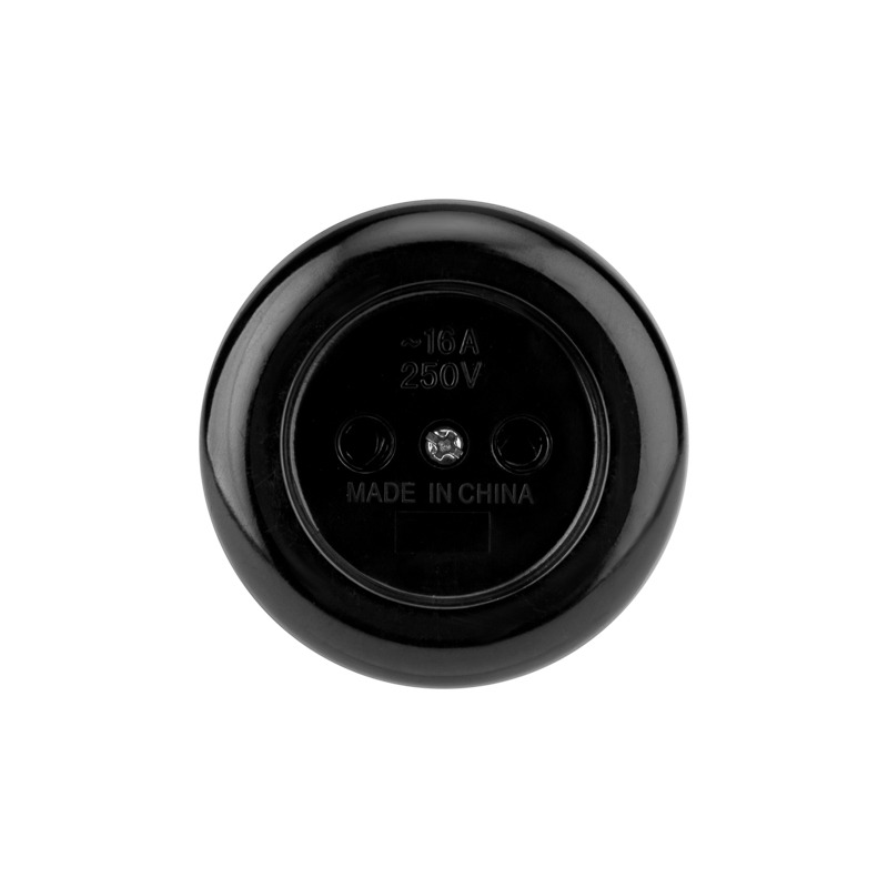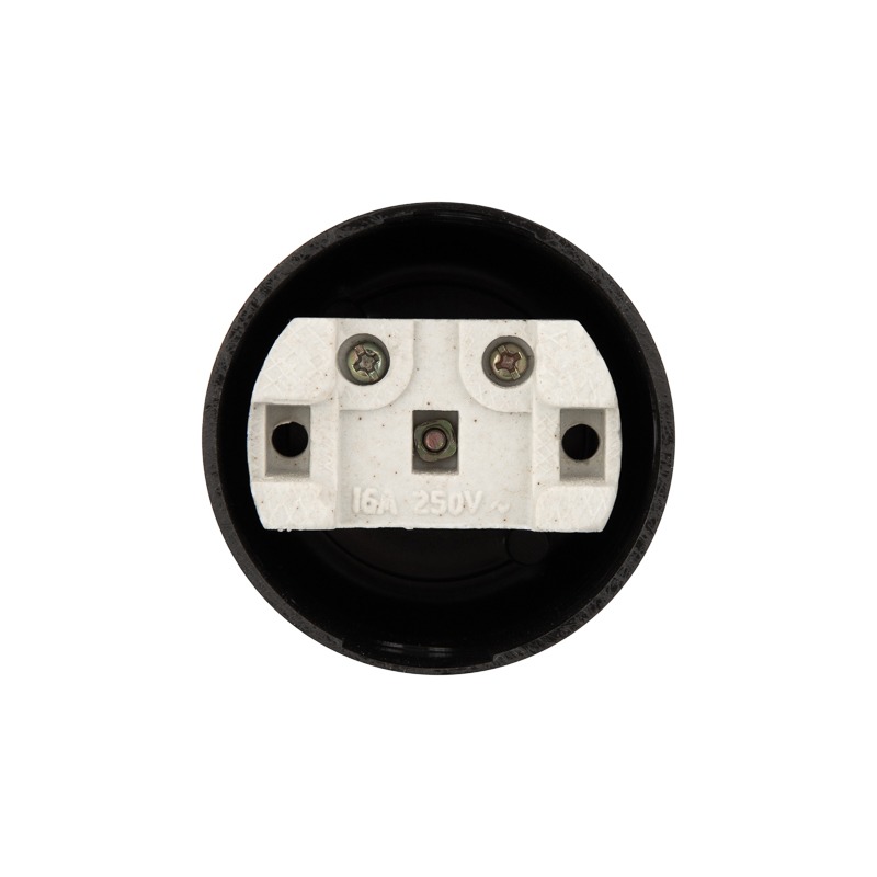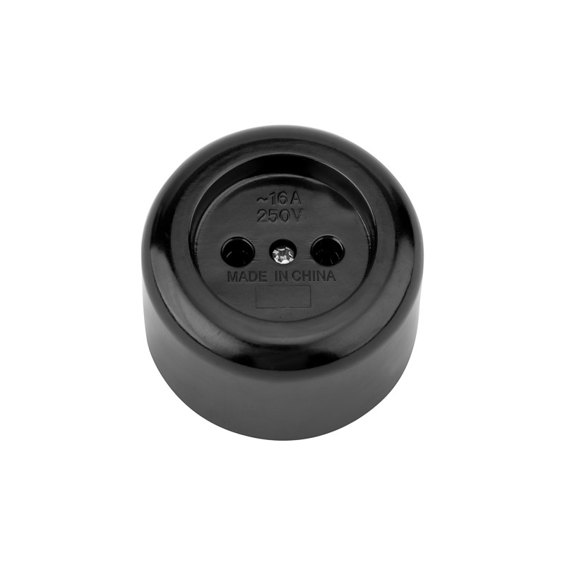 Розетка штепсельная карболитовая открытой установки без заземления предназначена для организации подключения различных электрических приборов напряжением до 250 В и током до 16 А при двухпроводной системе питания. Корпус розетки выполнен из карболита, что придает ему абсолютную негорючесть, химическую стойкость и высокие диэлектрические свойства. Основание изделия выполнено из керамики и оснащено латунными токопроводящими подпружиненными контактами с винтовыми контактными зажимами для присоединения проводников. Розетка не имеет корпуса на поверхности монтажа. Подпружиненные контакты изделия плотно удерживают стержни сетевой вилки, что обеспечивает более надежный контакт. Для монтажа розетки на поверхности необходимо открутить винт с лицевой стороны розетки. Вынуть керамическое основание. Затем установить керамическое основание на поверхность, зафиксировав его двумя винтами или саморезами (в комплекте не поставляются), подключить к клеммам проводник. Для прохождения провода в розетку необходимо выломать специально подготовленную боковую поверхность корпуса по выемке. Установить корпус на керамическое основание. Розетка легко монтируется, имеет высокую надежность и долгий срок службы. Для обеспечения безопасности, все детали, соприкасающиеся с токоведущими частями, выполнены из огнеупорного материала, устойчивого к температуре до +850 ⁰С.