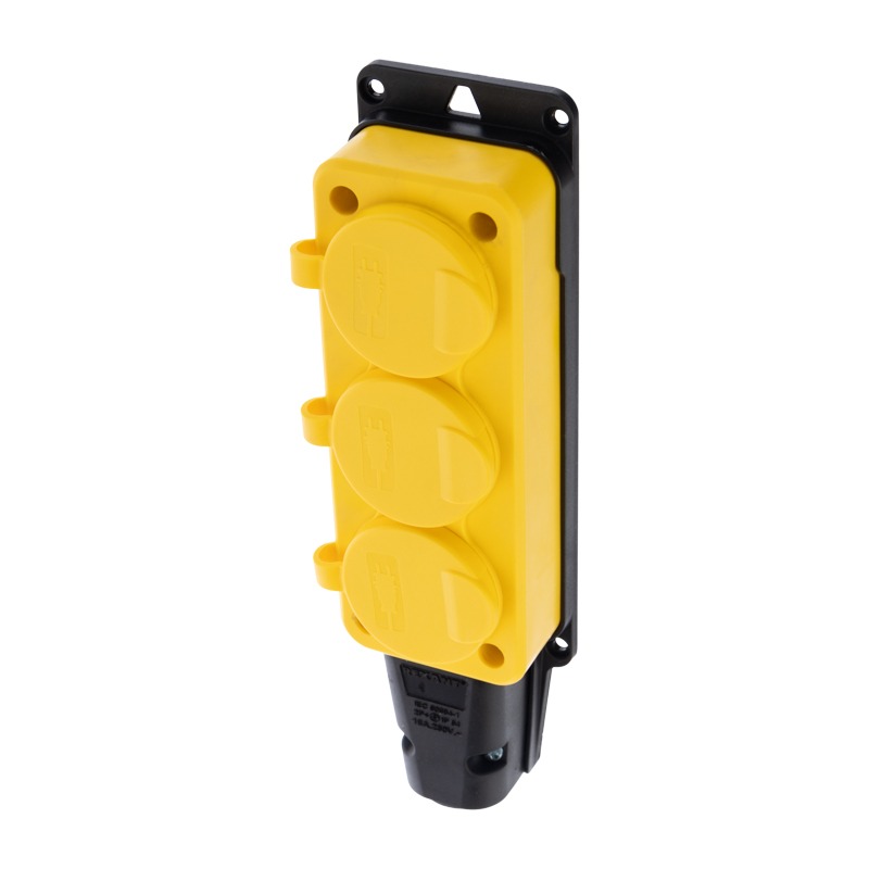 Розетка штепсельная трехместная влагозащищенная, с/з, 16 А, IP54, каучук желтая REXANT