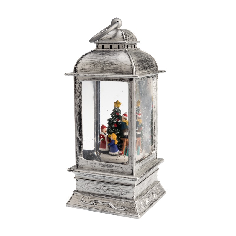 Декоративный фонарь «Рождество» — великолепное интерьерное украшение, символизирующее Новый год и Рождество. Светильник с эффектом снегопада и подсветкой выполнен в серебристом цвете, внутри находятся фигурки детей, наряжающих елку. Портативный фонарь питается от 4 батареек типа ААА или от сетевого блока через USB-шнур. Вьюга, создаваемая сверкающими блестками, кружится внутри колбы и подсвечивается белыми диодами. Декоративный фонарь станет прекрасным подарком детям и взрослым, принесет атмосферу зимней сказки в ваш дом.