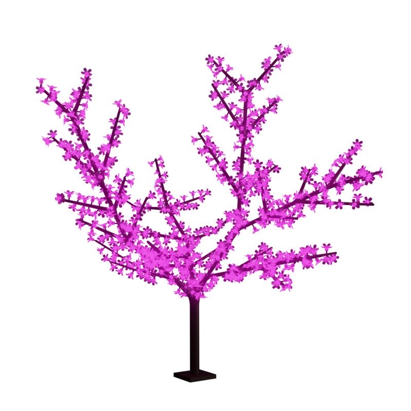 Светодиодное дерево «Сакура» высотой 2,4 метра с защитой IP65 — оригинальный, эффектный декор, который станет великолепным украшением интерьера или экстерьера. Раскидистая крона со множеством прозрачных пластиковых цветов достигает диаметра 2 метра. Внутри каждого элемента находится энергоэффективный безопасный диод фиолетового свечения — всего 1728 элементов. Ствол и ветви выполнены из черного ПВХ. Дерево имеет сборную конструкцию, которая легко монтируется. Для размещения на ровной поверхности предусмотрена металлическая подставка с отверстиями под анкерный крепеж.