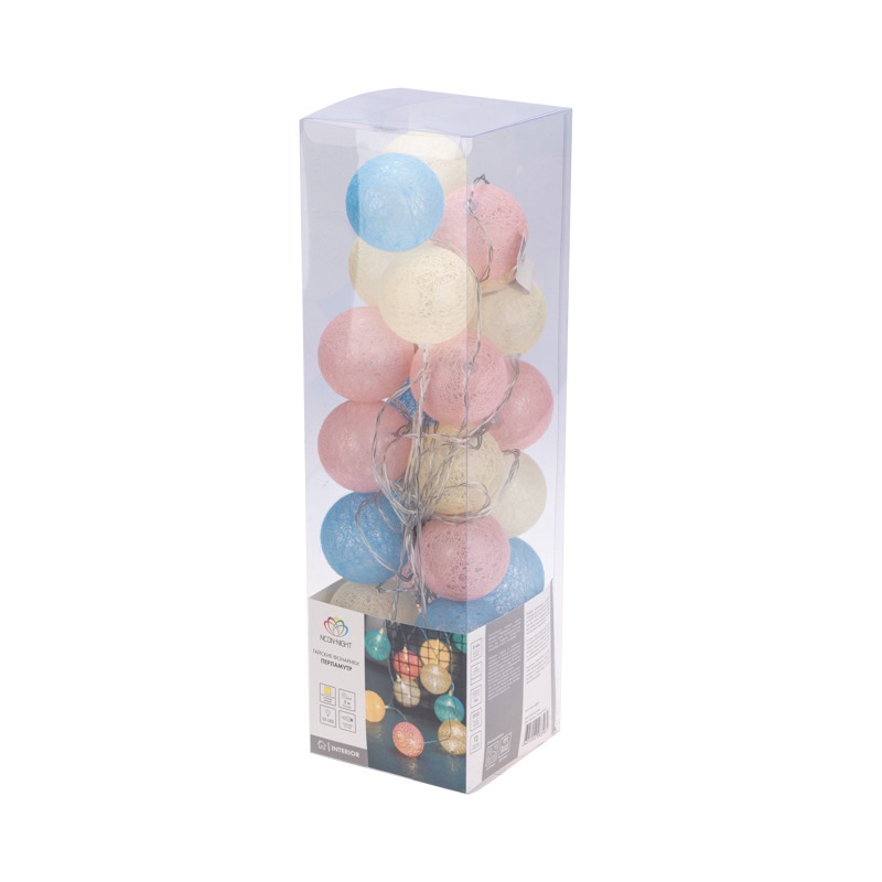 Тайские фонарики Перламутр – это светодиодная гирлянда, которая станет оригинальным и эффектным украшением интерьера. Благодаря необычному оформлению, гирлянда притягивает взгляды и создает уютную атмосферу в комнате, даже когда она выключена.<br> На проводе, помещенном в прозрачную изоляцию из ПВХ, располагаются 25 волшебных круглых фонариков из хлопковых нитей, способных превратить любое помещение в уникальное пространство.<br> В качестве источника питания гирлянды выступает USB-разъем, который крепится на дополнительный провод длиной 30 см. <br> Гирлянда с защитой IP20 предназначена для использования в помещениях.