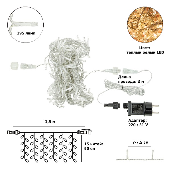 Электрическая гирлянда-занавес Winter Glade Теплый белый свет 195 ламп