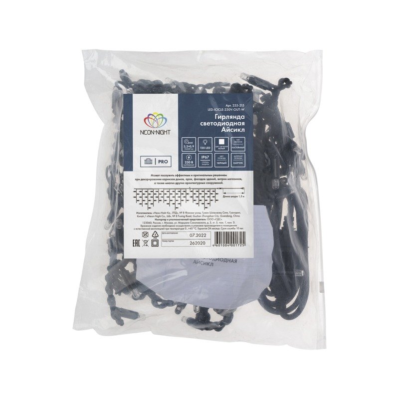 Гирлянда Айсикл (бахрома) светодиодный, 3,2 х 0,9 м, черный провод КАУЧУК, 230 В, диоды белые, 120 LED NEON-NIGHT