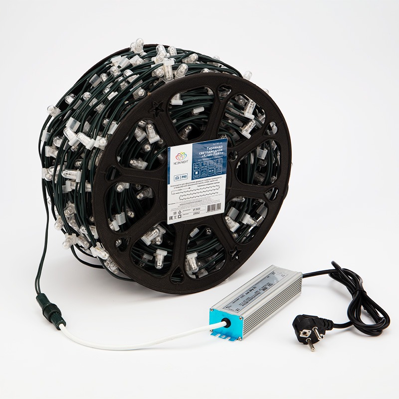 Данная гирлянда поставляется в бухтах по 100 м, представлена в белом цвете свечения светодиодов. Ее каждый 5 диод мерцает белым цветом.
