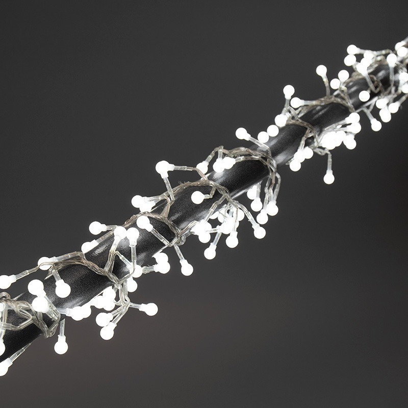 Гирлянда «Мишура» длиной 3 метра выполнена в виде объемной пушистой елочной мишуры. На концах многочисленных отводов расположены пластиковые шарики диаметром 1 см, внутри которых находятся светодиоды. Всего в изделии 288 диодов, излучающих белый свет нейтрального оттенка. Серебристый провод покрыт изоляцией из прозрачного ПВХ. Есть возможность собрать украшение длиной до 60 метров, соединив несколько гирлянд при помощи удобного разъема. Для подключения к электросети предусмотрен трехметровый кабель с контроллером. Устройство управления имеет 8 предустановленных режимов свечения с разной динамикой.