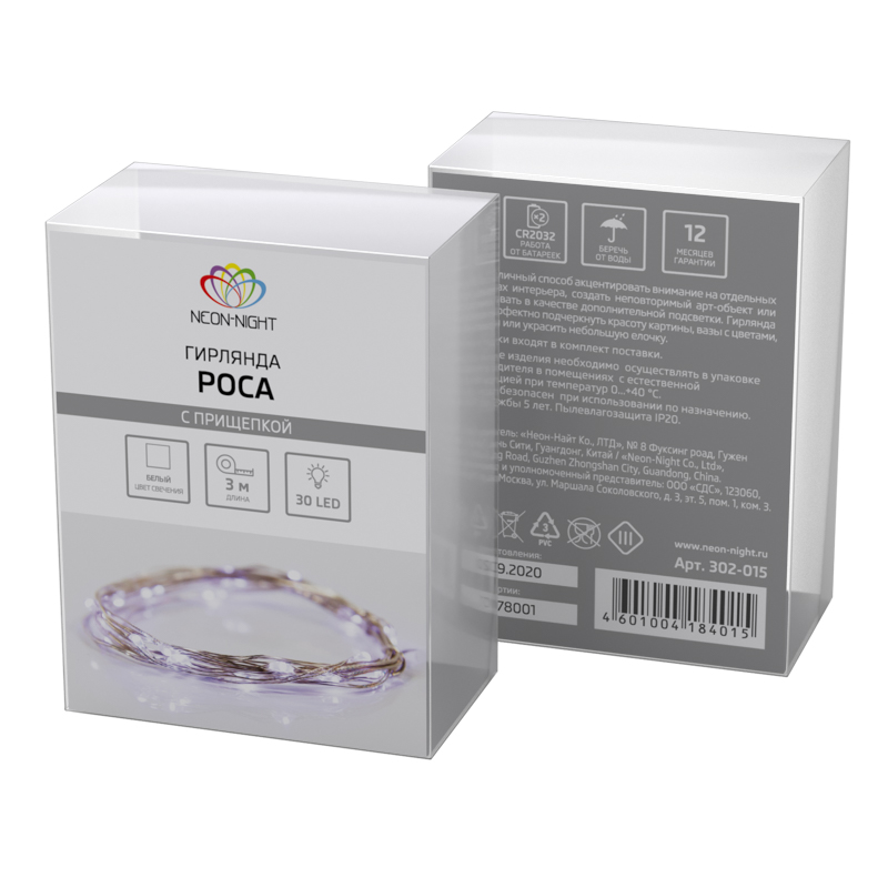 Гирлянда светодиодная Роса с прищепкой 3м, 30LED, БЕЛЫЙ, IP20, 2хCR2032 в комплекте NEON-NIGHT