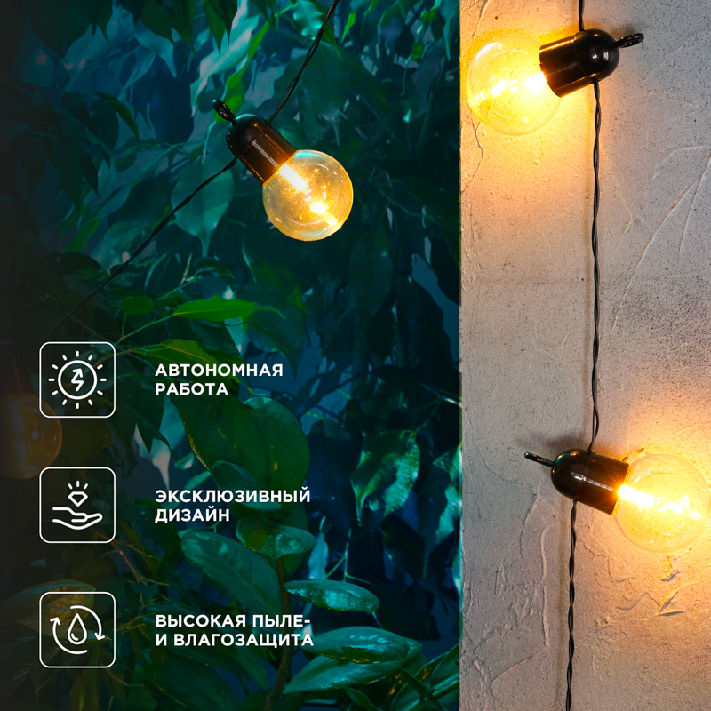 Накопленная энергия хранится во встроенном аккумуляторе, что позволяет гирлянде автономно функционировать около 6-8 часов и освещать окружающую территорию вечером и ночью, не требуя подключения к электросети.