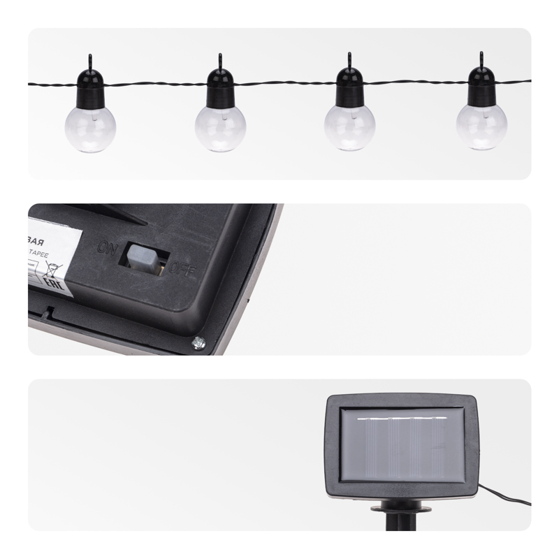 Гирлянда оснащена солнечной панелью, которая поглощает солнечные лучи в течение дня и преобразует их в электрическую энергию.