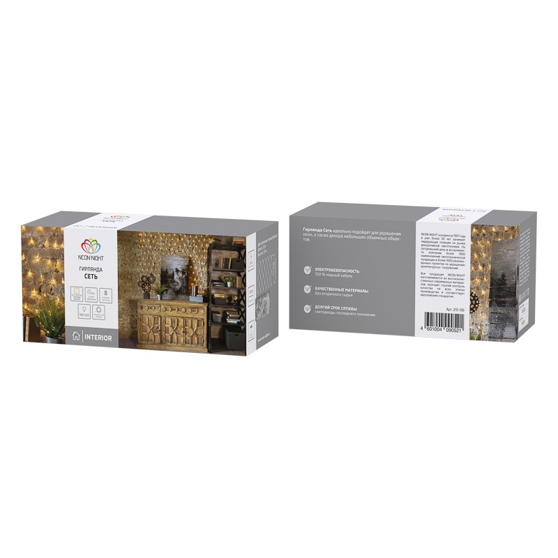 Гирлянда «Сеть» 1,8×1,5 м с защитой IP20 предназначена для использования в квартире, доме, офисе и других отапливаемых помещениях с нормальной влажностью. Гирлянда представляет собой воздушное полотно с крупными ячейками, выполненное из провода с прозрачной ПВХ-изоляцией. 180 экономичных светодиодов излучают яркий белый свет теплого оттенка. Для установки изделия удобно использовать присоски с крючками. Для подключения к электросети предусмотрен трехметровый кабель. Светодинамические эффекты переключаются при помощи контроллера — всего 8 режимов.